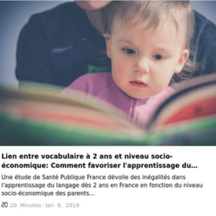 Le quotidien 20minutes a publié un article qui présente 1001mots, en réaction à une nouvelle étude scientifique de l’INED qui souligne que dès l’âge de 2 ans, les enfants les plus aisés ont 15% de mots de vocabulaire en plus que les plus défavorisés. Menée en France sur 11 000 enfants, l’étude confirme fortement la pertinence de notre diagnostic.L’article explique comment 1001mots transcrit les résultats des neurosciences en activités d’éveil simples pour les tout-petits.