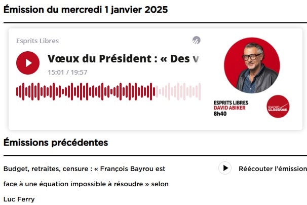 01/01/2025 – Emission « Esprits Libres » sur Radio Classique