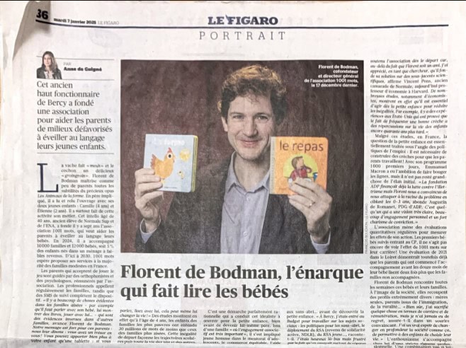 1 000 premiers jours : les inégalités au berceau – Le 21 décembre, Florent de Bodman, directeur de l’association 1001mots, était l’invité de l’émission Entendez-vous l’éco? . Aux côtés de Sylviane Giampino, Présidente du Haut Conseil de la famille, de l’enfance et de l’âge, le directeur de l’association 1001mots a insisté sur l’importance des 1000 premiers jours pour notre société dans son ensemble.