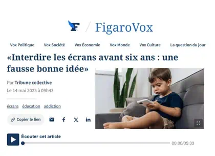 Le site du journal Le Figaro a publié la tribune « interdire les écrans avant 6 ans : une fausse bonne idée », rédigée par les cofondateurs et membres du conseil d’administration de l’association 1001mots.